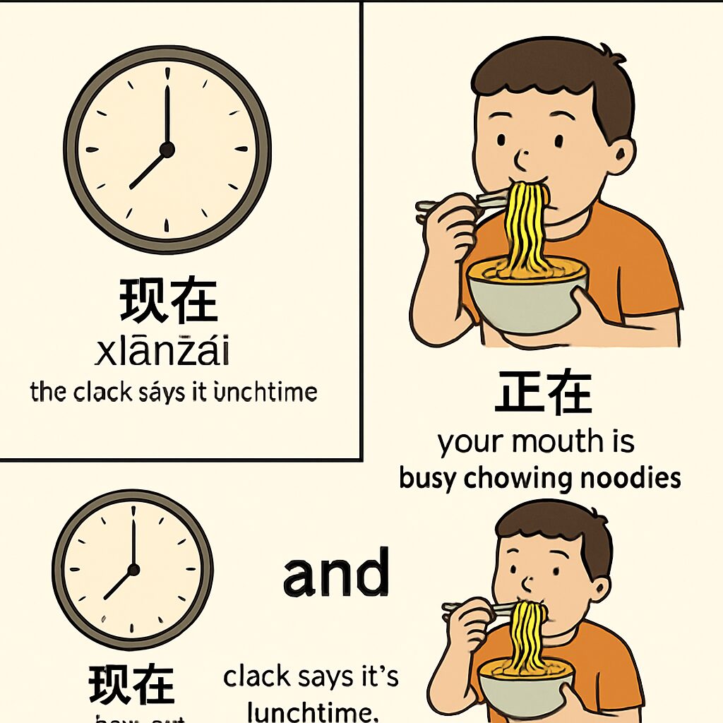 The Chinese words “现在[xiànzài]”and “正在[zhèngzài]” are used differently in terms of grammar and meaning.